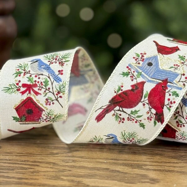 Wired ribbon with red cardinals, blue jays and red and blue bird houses would be a perfect addition for a Christmas project or arrangement. Made of fabric and wire and measures 2.5 inches wide by 10 yards long.