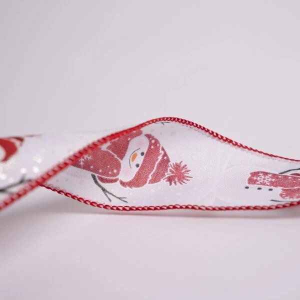 This white ribbon with red edging features snowmen wearing red scarves and measures 2.5 inches in height and 10 yards in length.