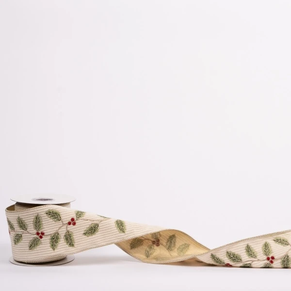 This corduroy ribbon features holly leaves and berries, and measures 4 inches in height.