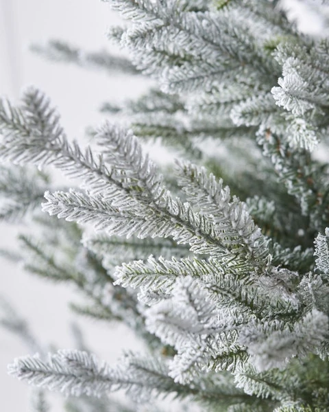 - 5ft Snowy Flocked Norway Spruce Christmas tree with 1,794 tips with unswept hinged branches.Â
