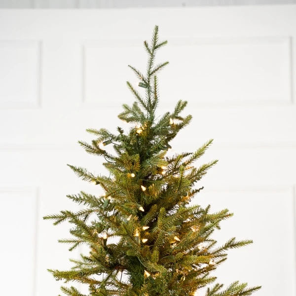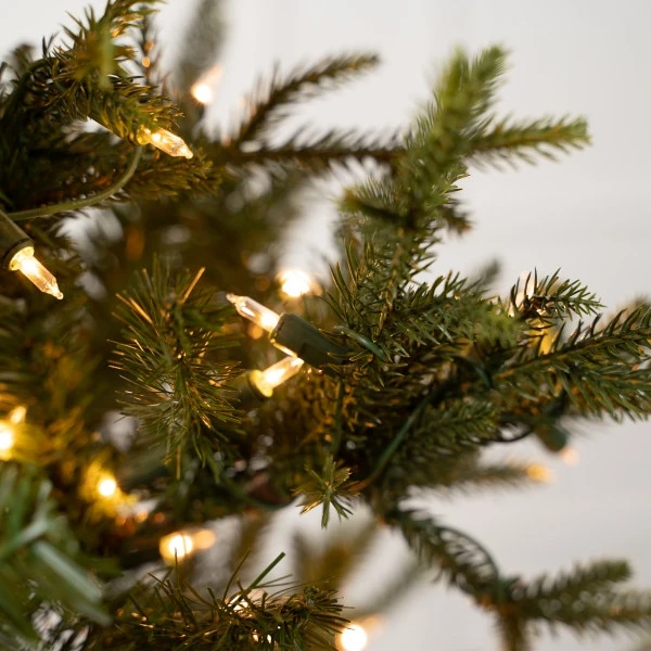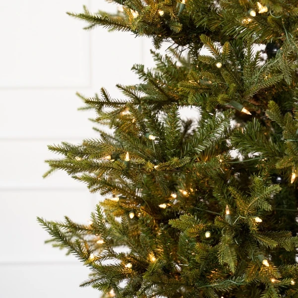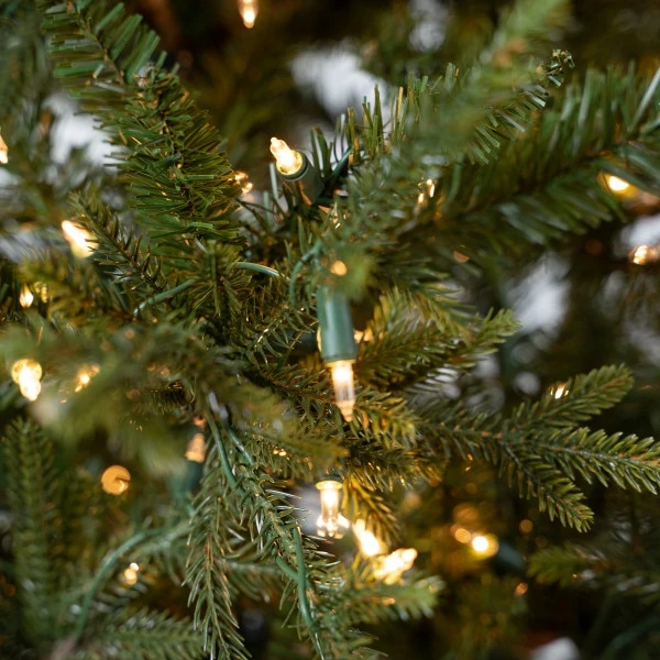This beautiful spruce features a height of 7.5 feet tall, 600 warm white LED lights, 1,106 tips, and a diameter of 48″.