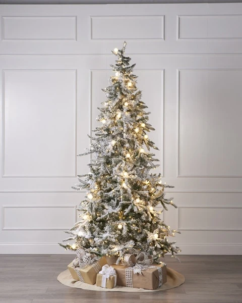 - 7.5ft Snowy Flocked Slim Balsam pine tree features 1278 tips.