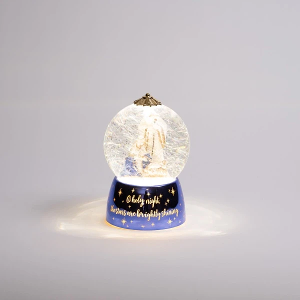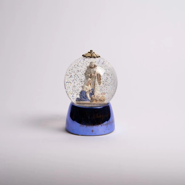 This water ball features the holy family inside with glitter falling around them and says O Holy Night on the outside. It measures 7 inches in height.