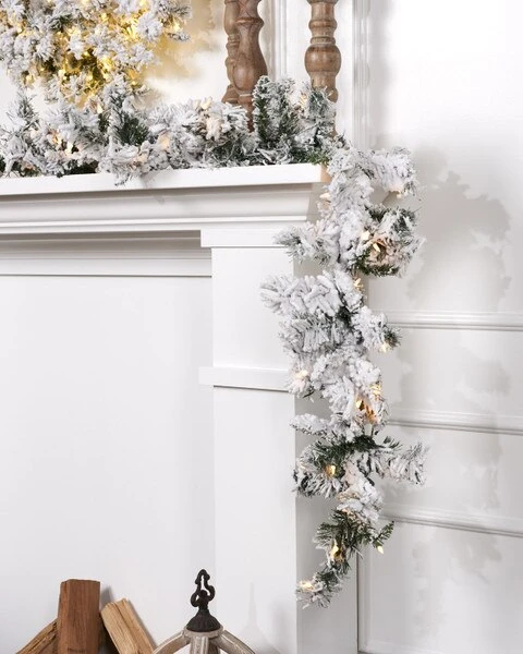 - 9ft Balsam Snowy Flocked Pre-lit Garland with 150 tips and fluffs out to 10in in diameter..