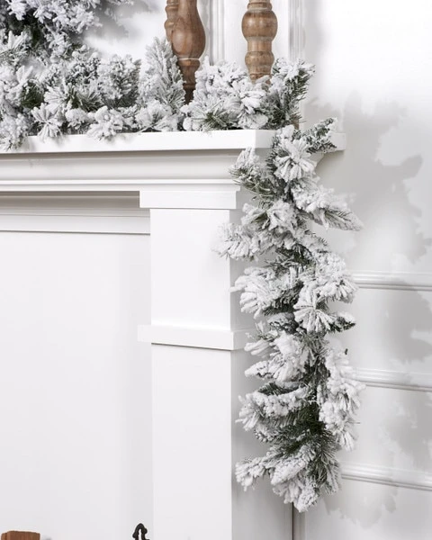 - 9ft Balsam Snowy Flocked Garland fluffs to 10in in diameter.