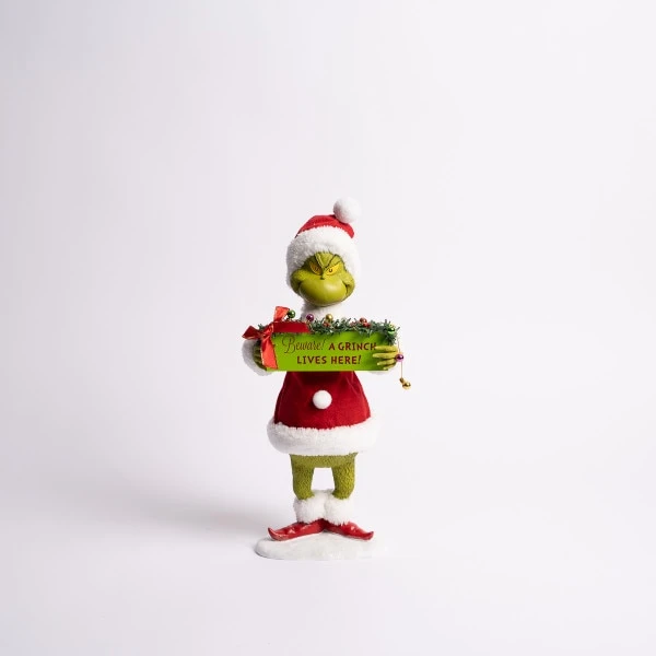The Grinch is warning people near and far, by holding a sign that says Beware. This item measures 12.5 inches in height.