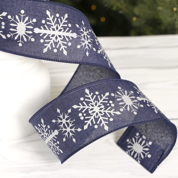 This ribbon features a blue sheer base fabric with grey silver snowflakes covering it all.