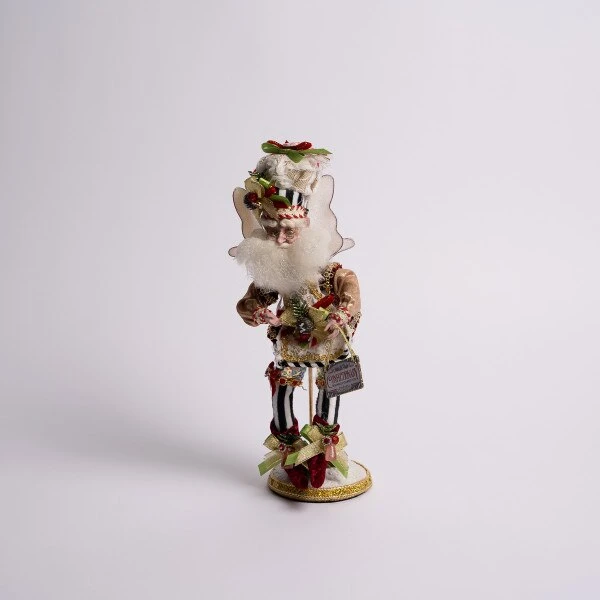 This Mark Roberts small fairy features black and white striped pants and holds a sign introducing the North Pole Kringle Candy Company.