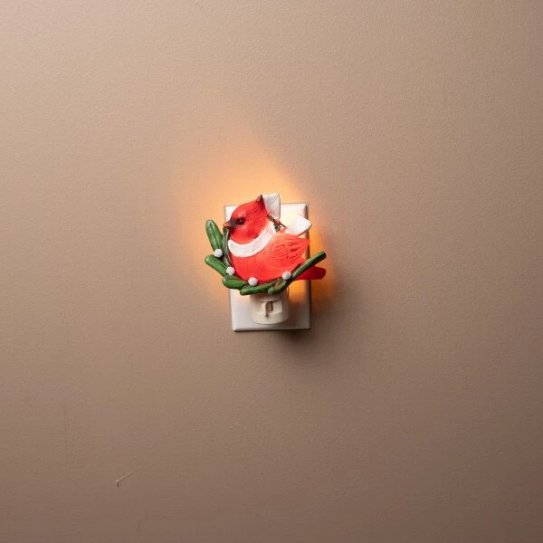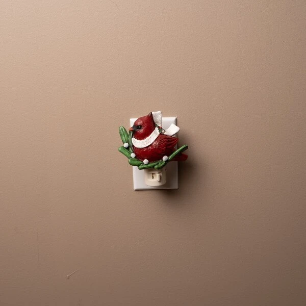 This nightlight features a cardinal sitting on a leaf, wearing a white scarf with holly. This item measures 4.25 inches in height.