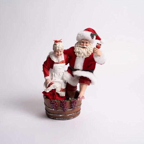 Santa and Mrs. Claus are crushing the grapes, to make the wine for the holiday celebration. This item measures 10.5 inches in height.
