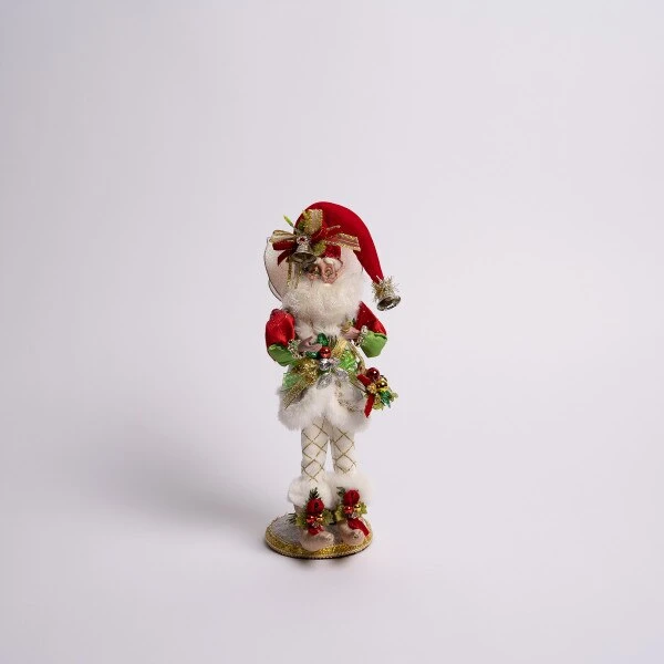 This Mark Roberts small fairy features white pants with gold accents and has bows with balls and bells hanging from his hat.