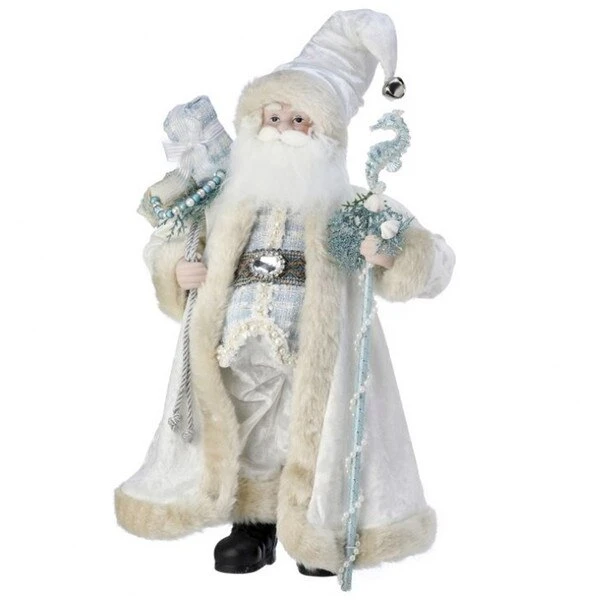 This Santa is dressed in blue and white and holds a sack of gifts over his shoulder, and a staff with a seahorse and seashells in the other hand. It measures 18 inches in height.