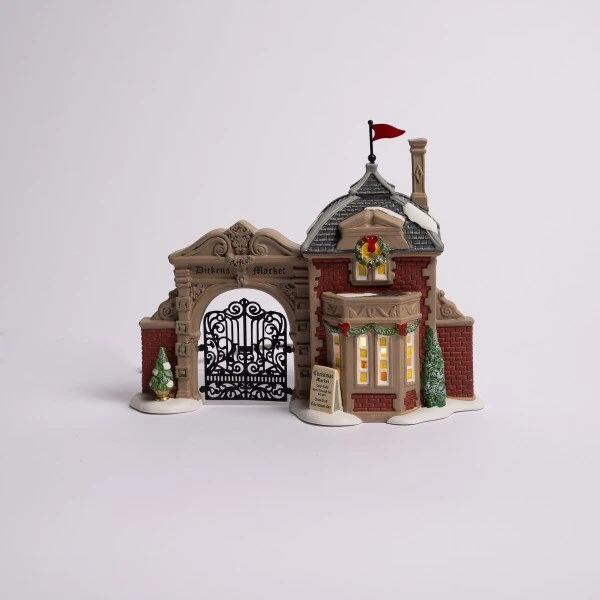 This item features the Dickens Market with a black gate for the entrance and is part of the Dickens Village collection. It measures 6.22 inches in height.
