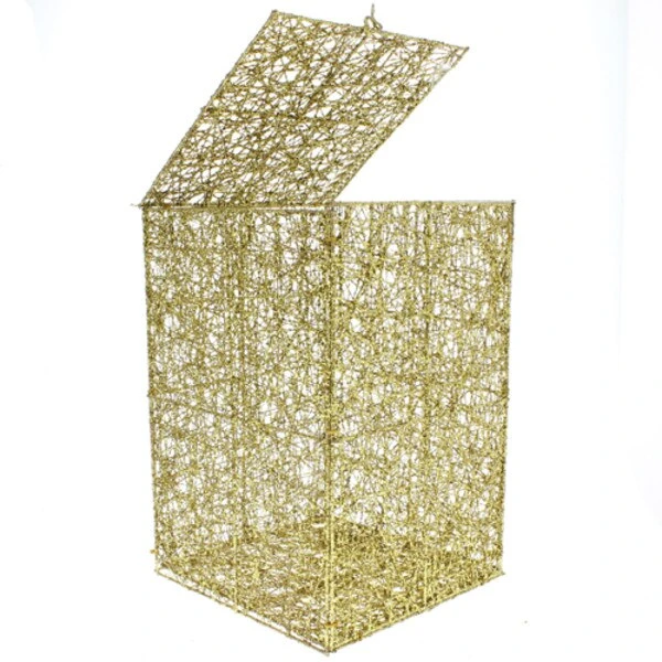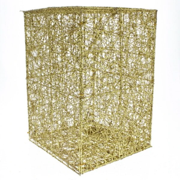 Our Gold Mesh Boxes are sprinkled with glitter that adds additional glitz. They can be filled with lights, a figurine, an arrangement or with anything your imagination dictates. Our floral department likes to add a gift wrap of ribbon on the outside and a beautiful arrangement on the top. Let your imagination go wild with this amazing box. Measures 12in H x 8in W x 8in L.