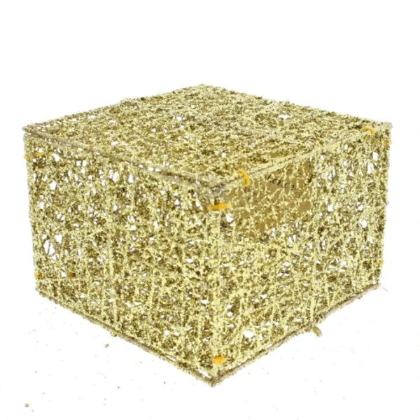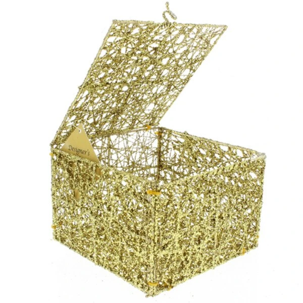 Let your imagination run wild with creative decorating ideas for this beautiful glittery Gold Mesh Box. Add your own touches in it and on it for the perfect centerpiece. Measures 4in H x 6in W x 6in L.