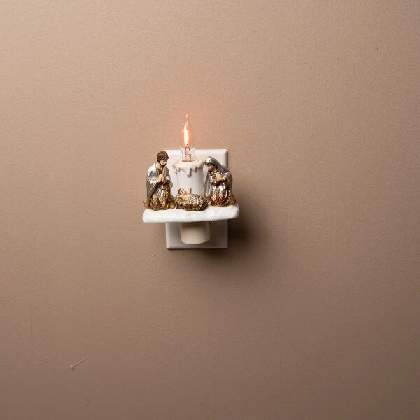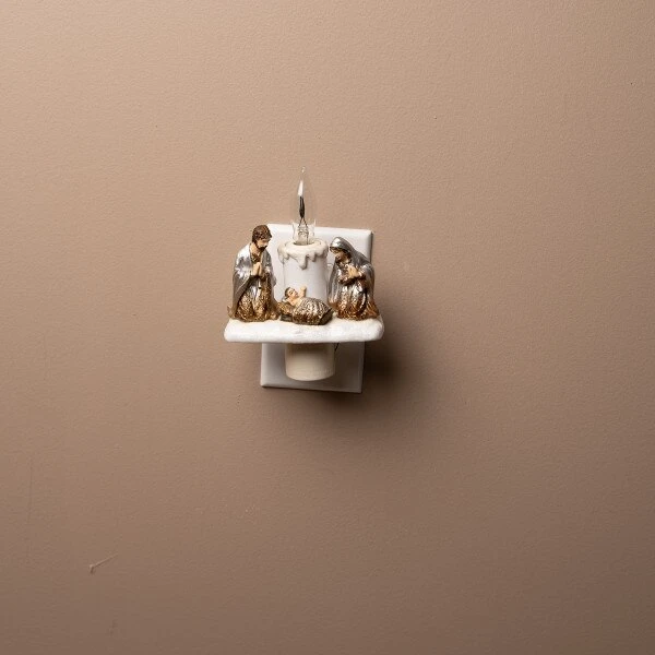 This nightlight features the holy family consisting of Mary, Joseph, and baby Jesus. It measures 5.5 inches in height.