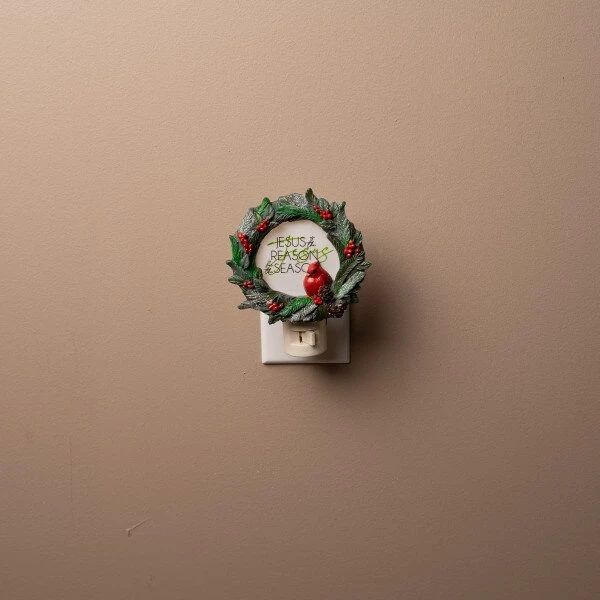 This nightlight features a cardinal sitting on a wreath with the words “Jesus is the reason for the season” inside. It measures 5.5 inches in height.