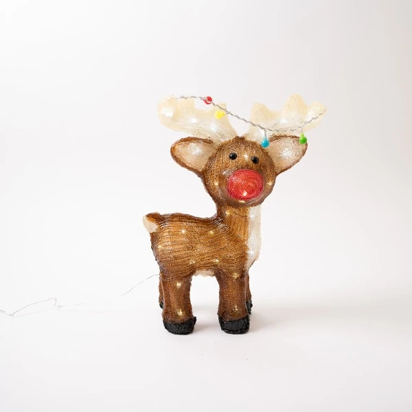 Sweet little Rudolph must have gotten into the Christmas lights! He has a string of Christmas lights tangled in his antlers.