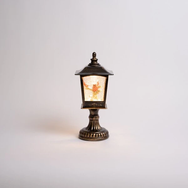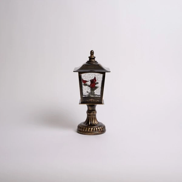 This brown lantern features 3 cardinals sitting on branches glitter falling around them and has LED lighting. It measures 12 inches in height.