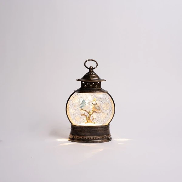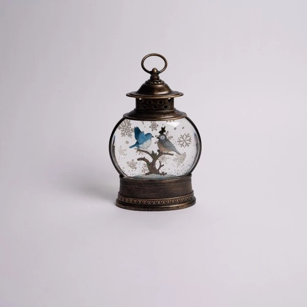 This lantern features two birds sitting on branches with snowflakes on the glass. This lantern has LED lighting and measures 10 inches in height.