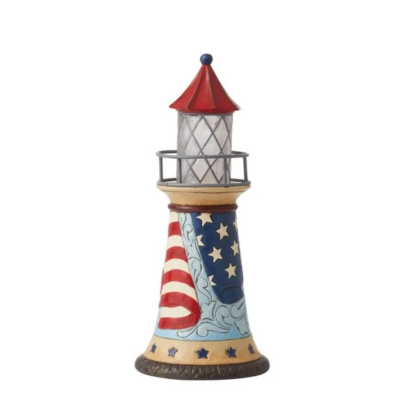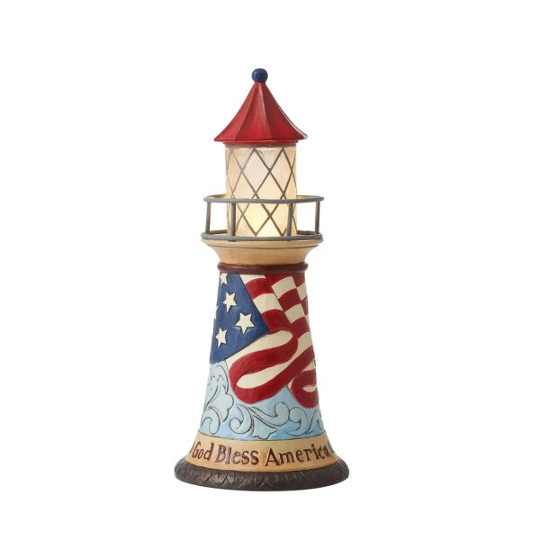 This patriotic lighthouse shows support for our troops, with the light shining bright to help find their way home. This item measures 10 inches in height.
