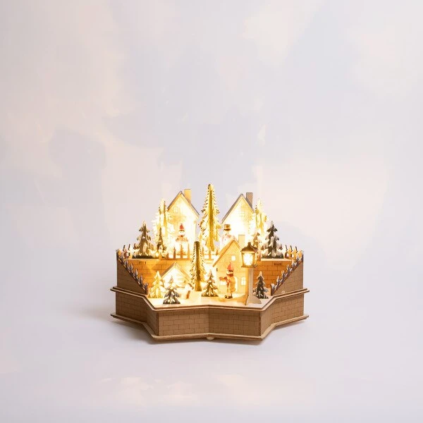 This wood cut star shape features a wintery scene and has LED lighting. It measures 8 inches in height.