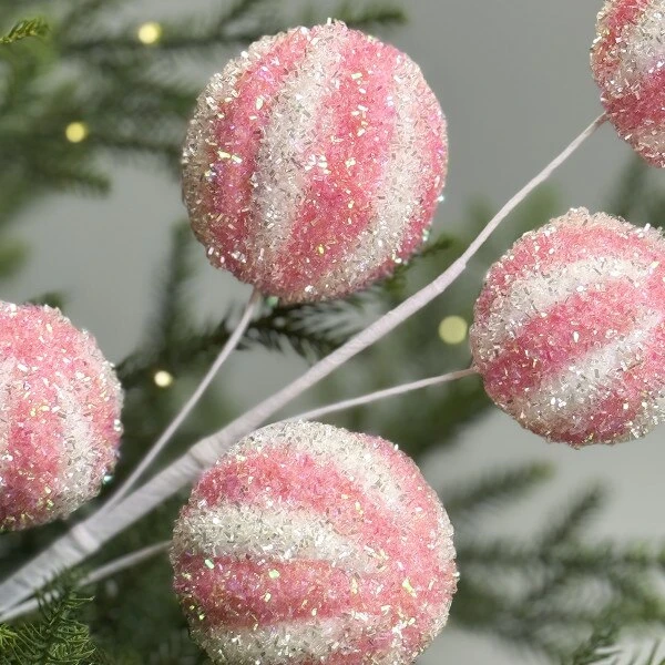 This spray features five tinsel balls that are striped in pink and white.
