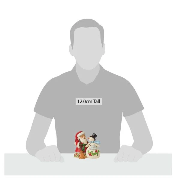 Santa is hanging out with his good friend. He is offering him a broom to hold in his hand. This item measures 4.75 inches in height.