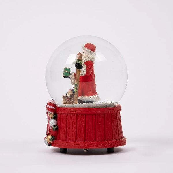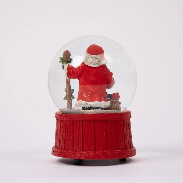 This item features Santa in a water globe holding his staff with a pinecone on top. It measures 5 inches in height and winds up to play “We wish you a merry Christmas”.