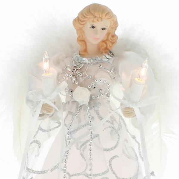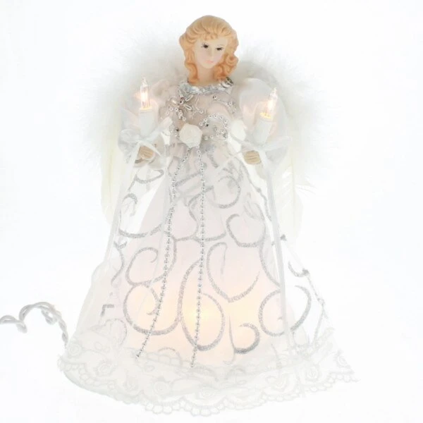 Add to the lighting and decor of your Christmas tree with Kurt Adler`s white and silver angel treetop. This beautiful 9″ angel is dressed in a snow-white gown with silver accents. She is lighted from within her dress and her candles. This is sure to be the perfect finishing touch to any tree.