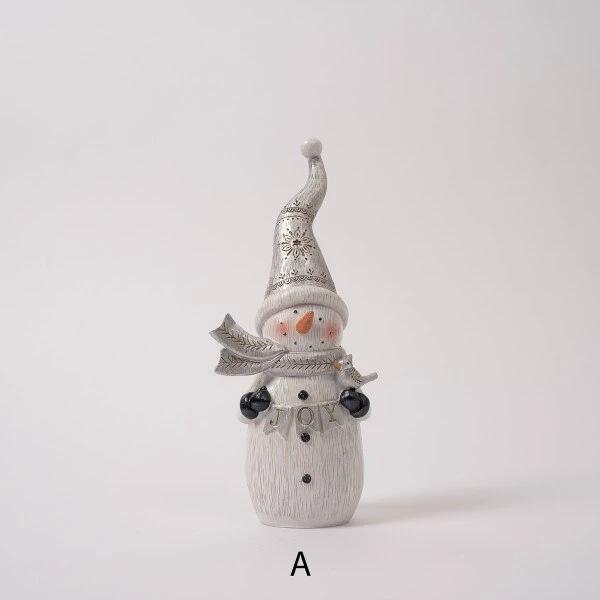 This assortment of snowmen features one with a silver cap and holding a sign that says “Joy”, and the other one is wearing a silver top hat and petting his dog. Each sold separately and measure 10 inches in height.