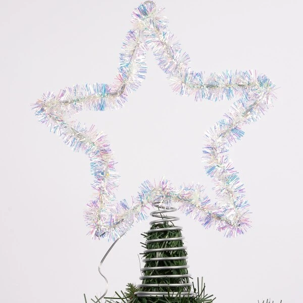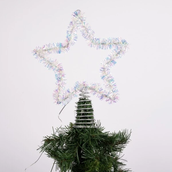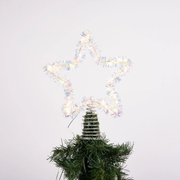 This silver star tree topper lights up with warm white lights. It measures 12.75 inches in height.