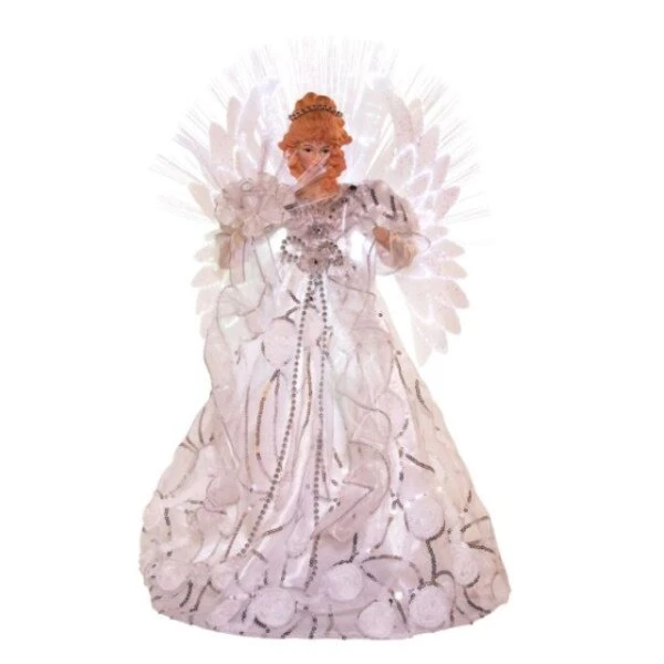 This Kurt Adler white and silver fiber-optic angel treetop is a beautiful way to accent the lighting on your Christmas tree. The angel is dressed in a ling white gown with silver accents, she is surrounded by a multicolor fiber-optic effect.