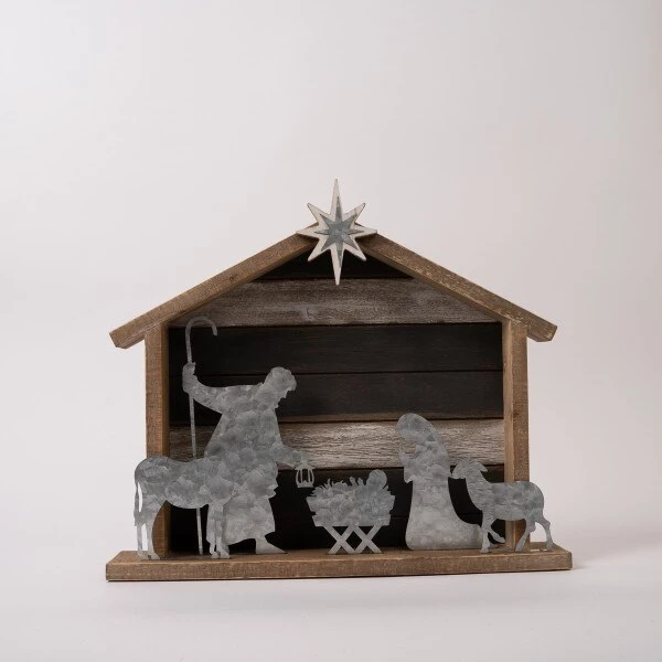 This item features a wooden creche with a nativity scene in front. It measures 15.75 inches in height.