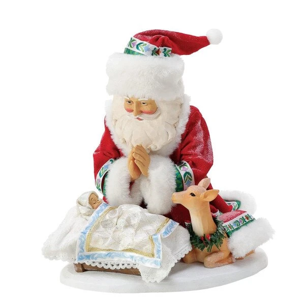 Santa is kneeling by the babe wrapped in love, with a deer at his side that shows love is enough. This item measures 9 inches in height.